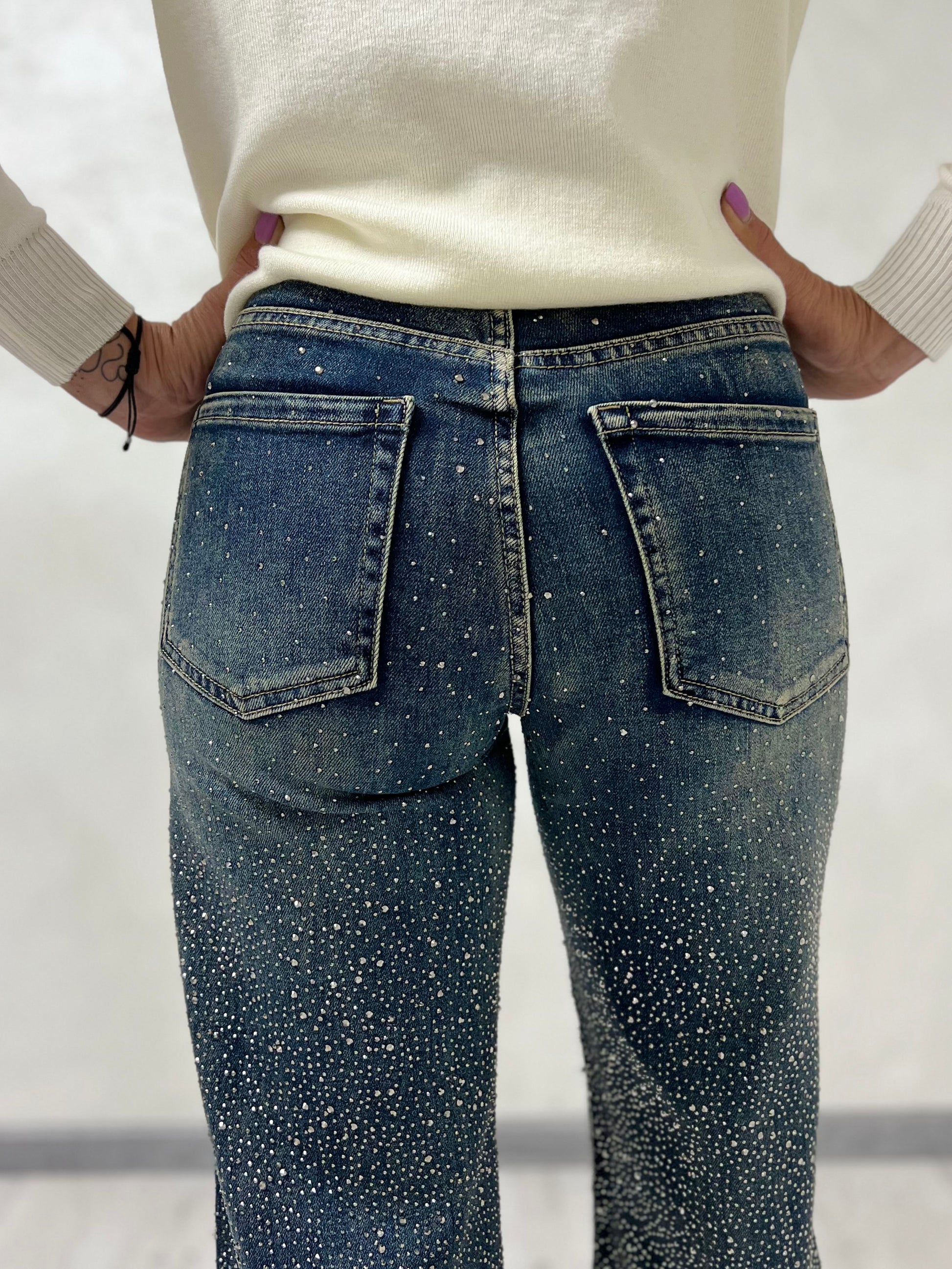 Jeans a gamba ampia con fit morbido e femminile, impreziositi da una pioggia di microbrillantini che si estende sia sul davanti che sul retro.