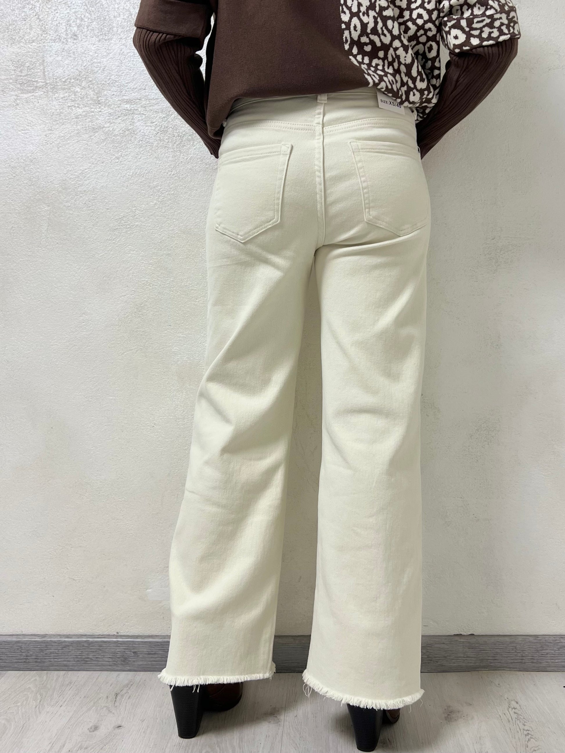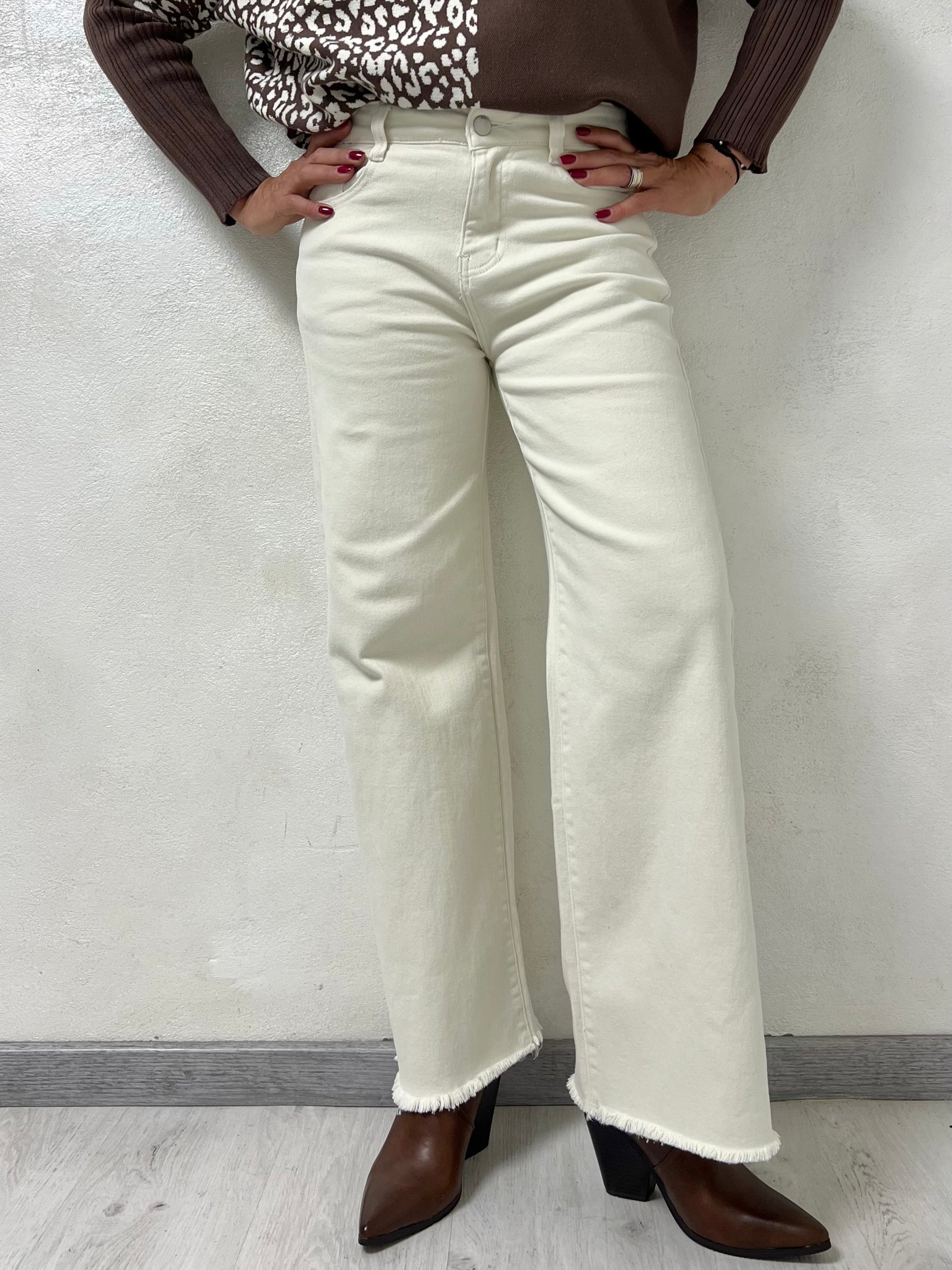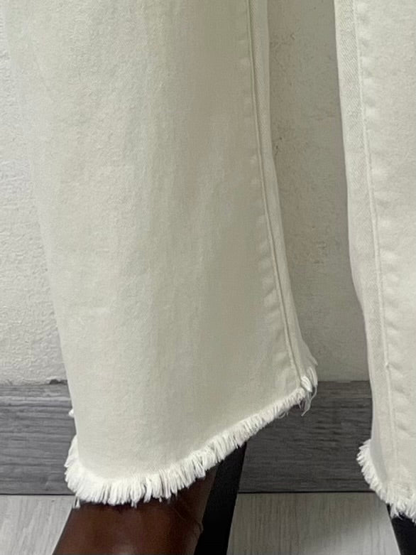 Il fondo sfrangiato dona carattere e modernità, mentre la gamba morbida e dritta valorizza ogni silhouette. Da abbinare a stivaletti, sneakers o anfibi.