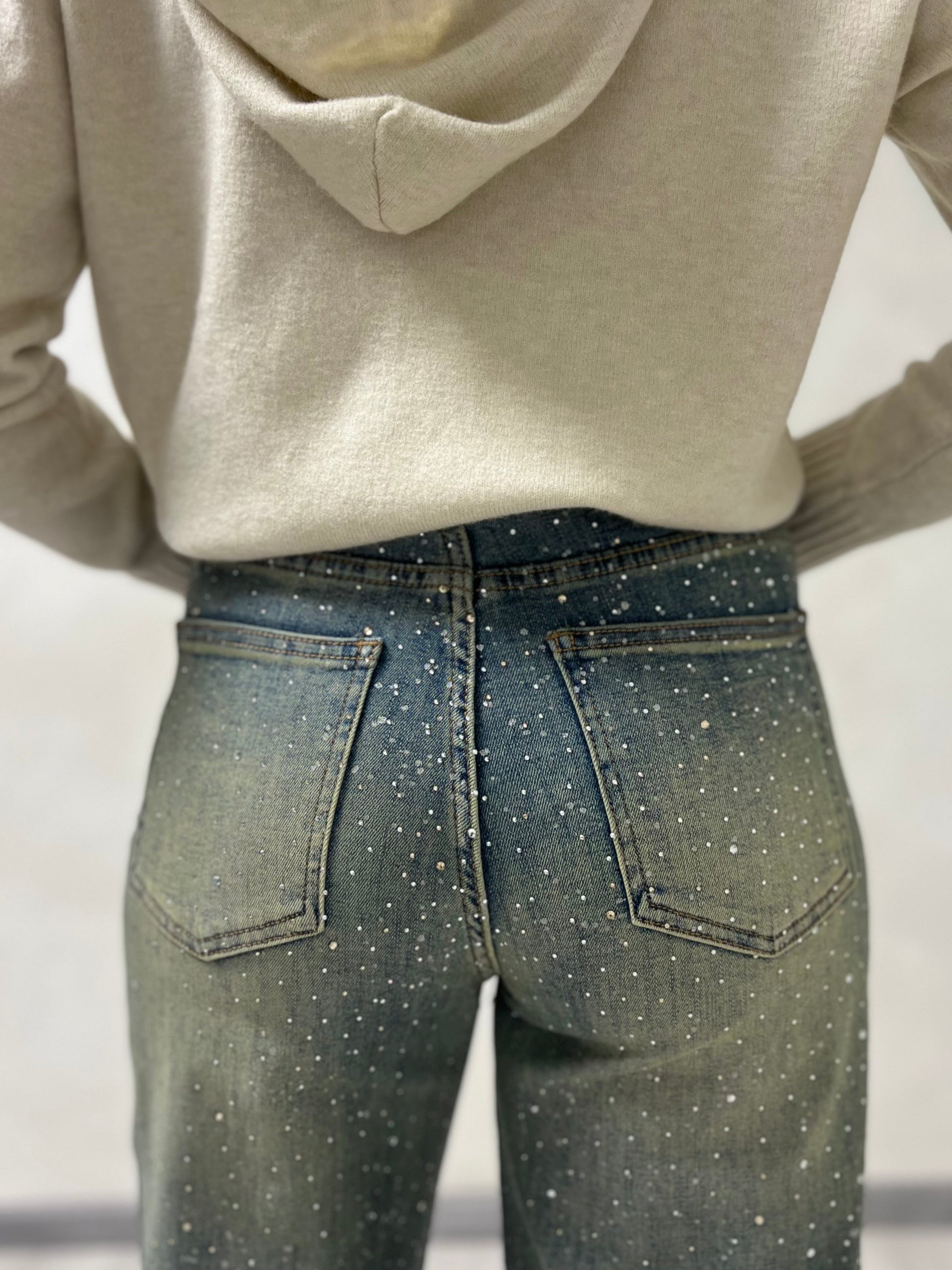 Realizzato in denim morbido, presenta una sfumatura vintage con leggera sabbiatura sulle gambe e un dettaglio unico: una pioggia di puntini argento con microglitter e piccoli swarosky che illuminano sia la parte frontale che posteriore.