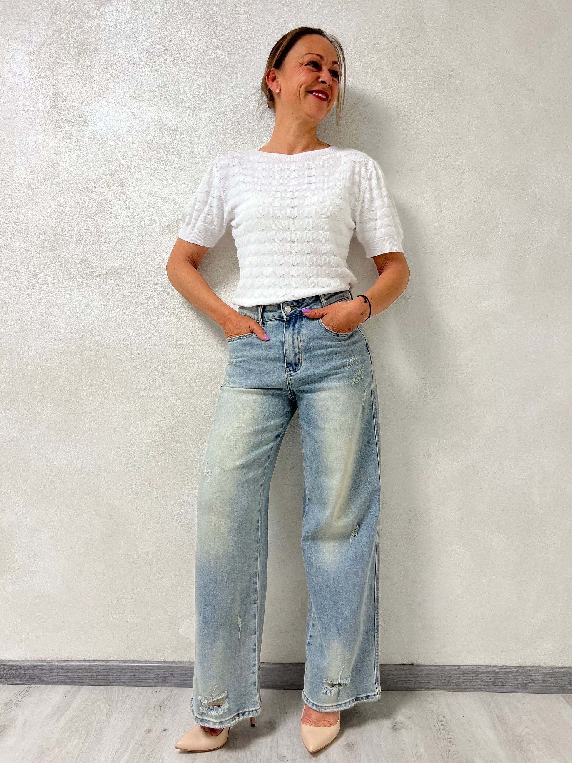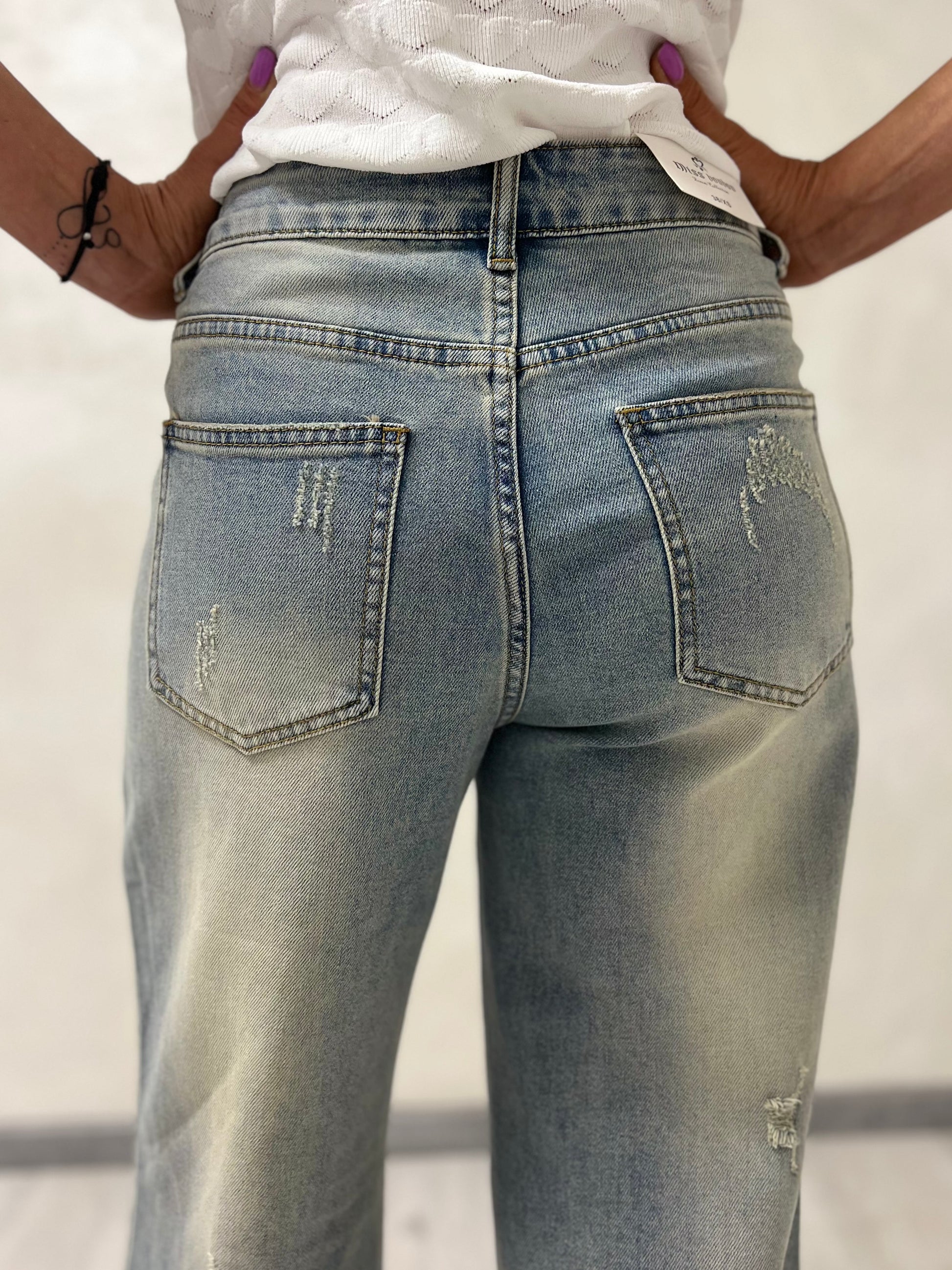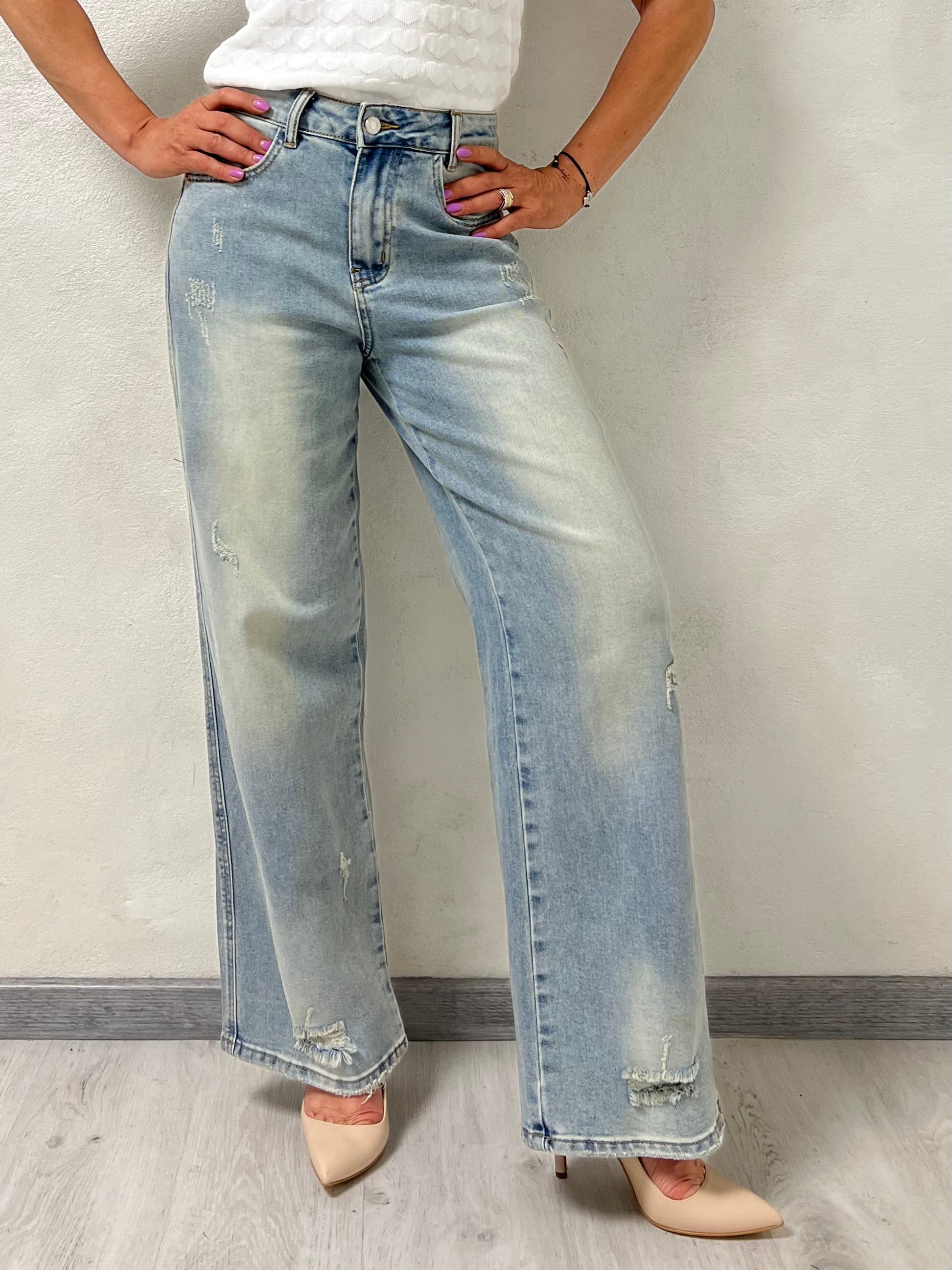 Il jeans Cloe è un capo dal carattere deciso e attuale. Con la sua gamba ampia e il lavaggio chiaro effetto vintage, dona un tocco grintoso a ogni look. I dettagli strappati sul davanti aggiungono un tocco urban, mentre anche sul retro, nella parte bassa, sono presenti strappature che completano il design con un tocco autentico. Un denim perfetto da abbinare a t-shirt, camicie o maglie strutturate.