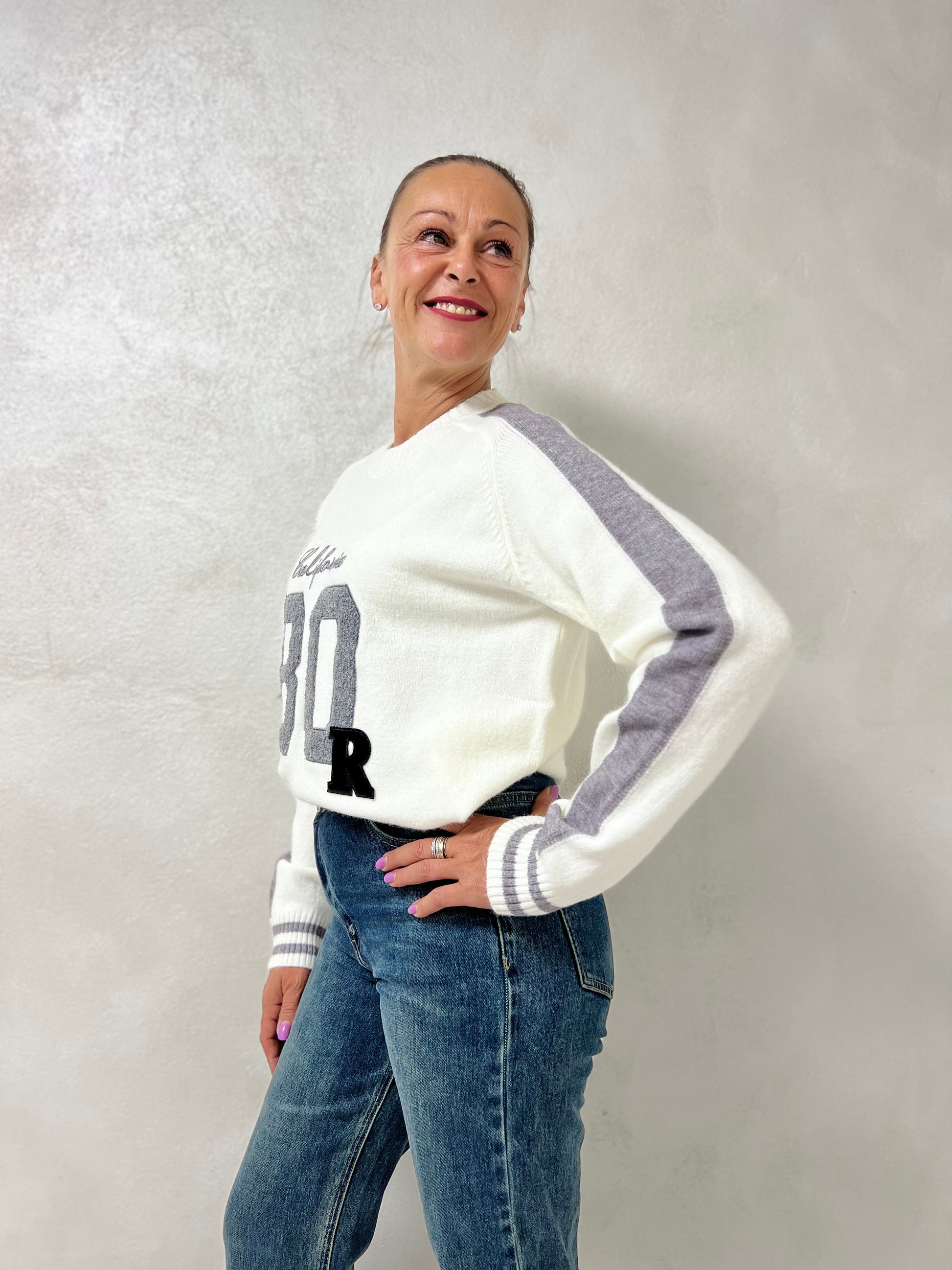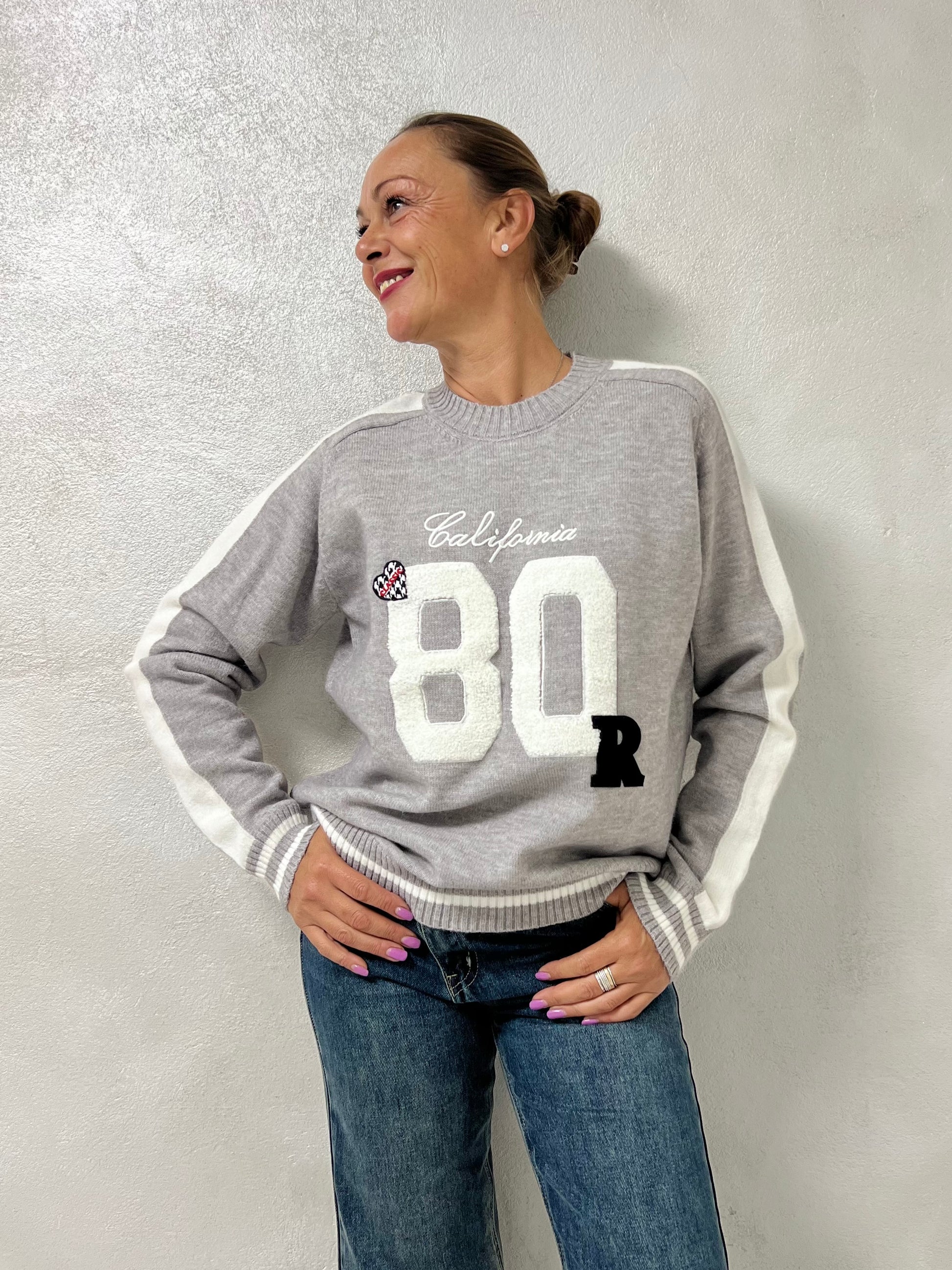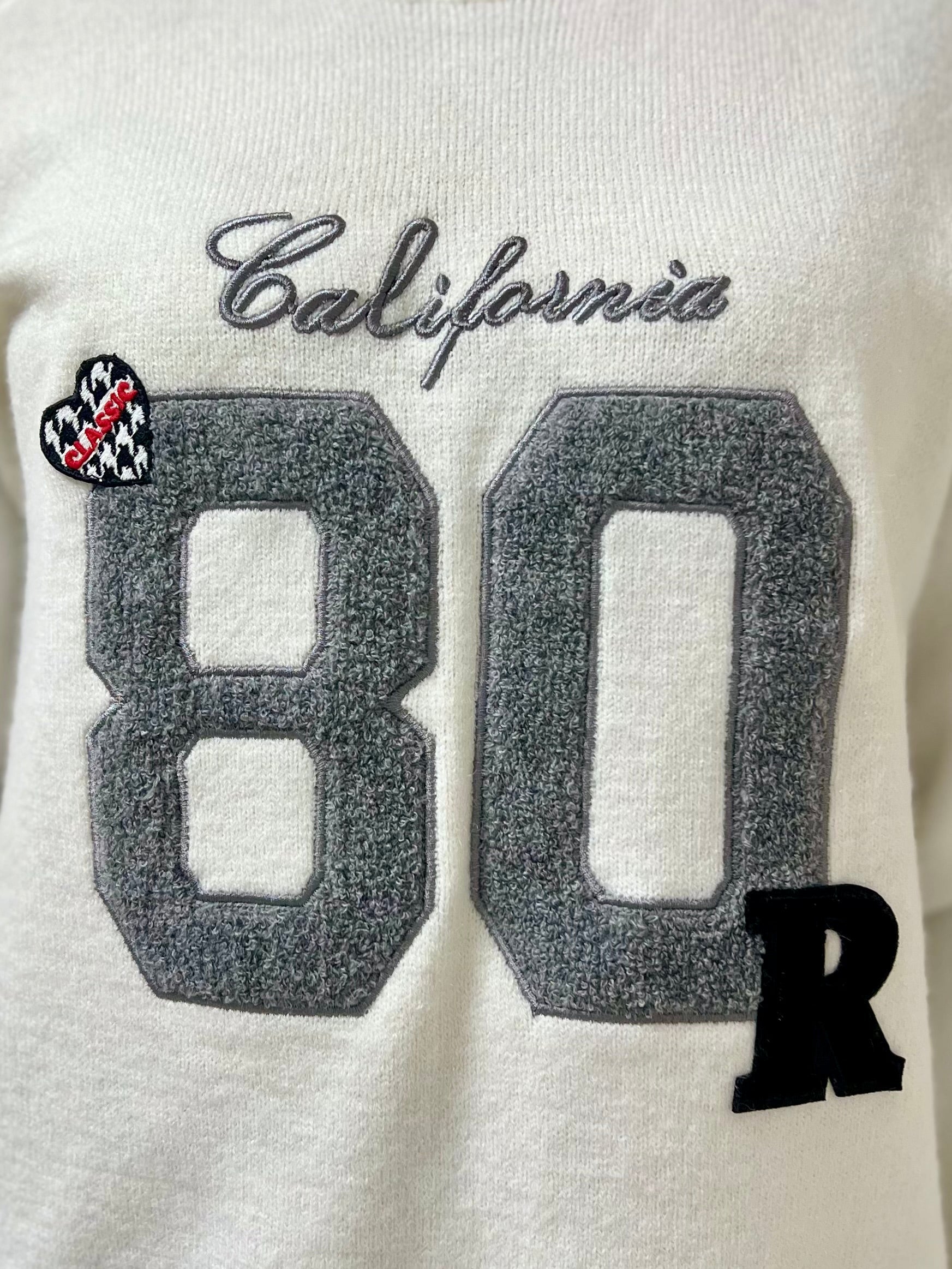 Maglioncino stile college con scritta “California 80R”, perfetto per dare un tocco casual e moderno ai tuoi outfit.