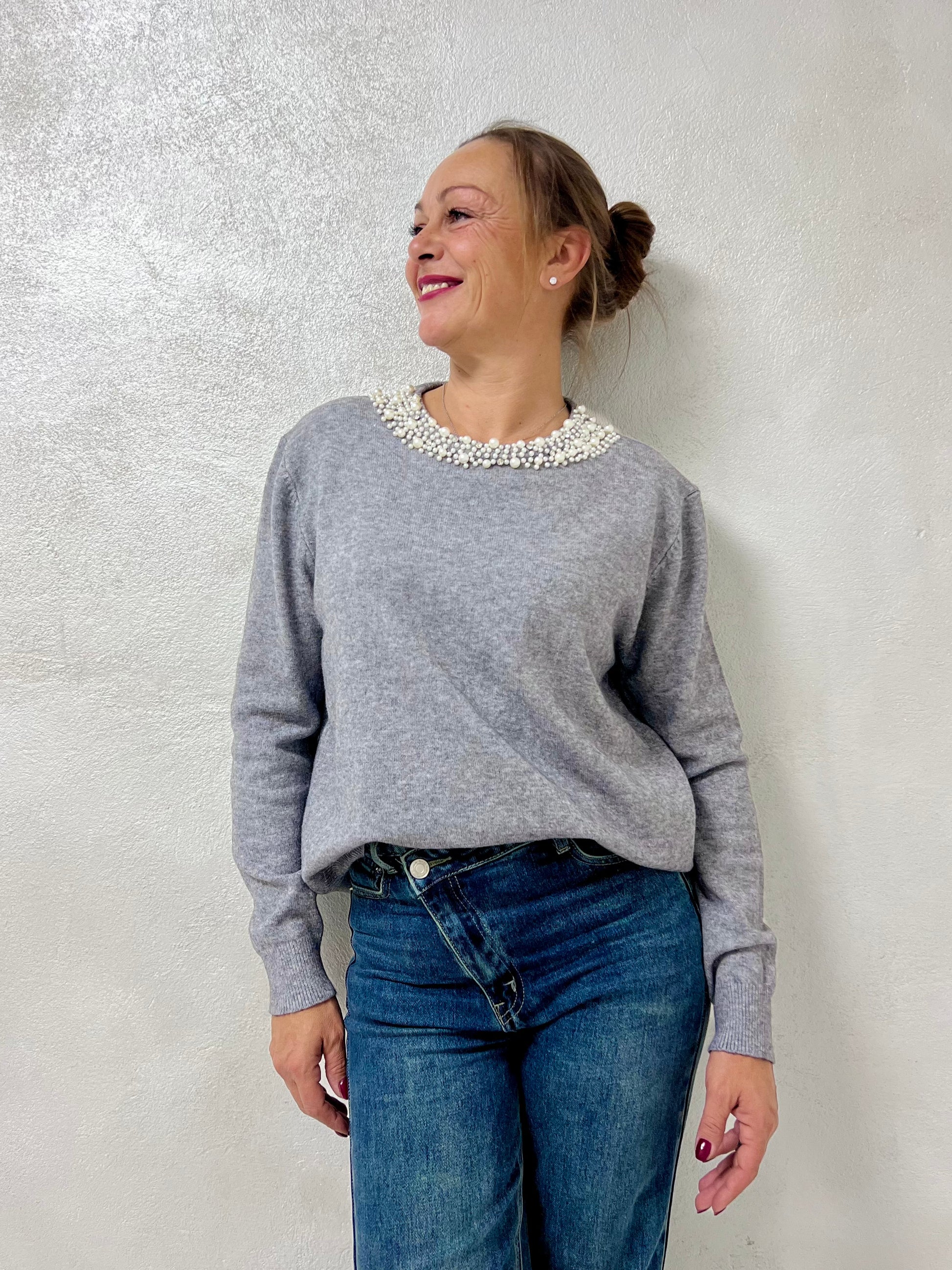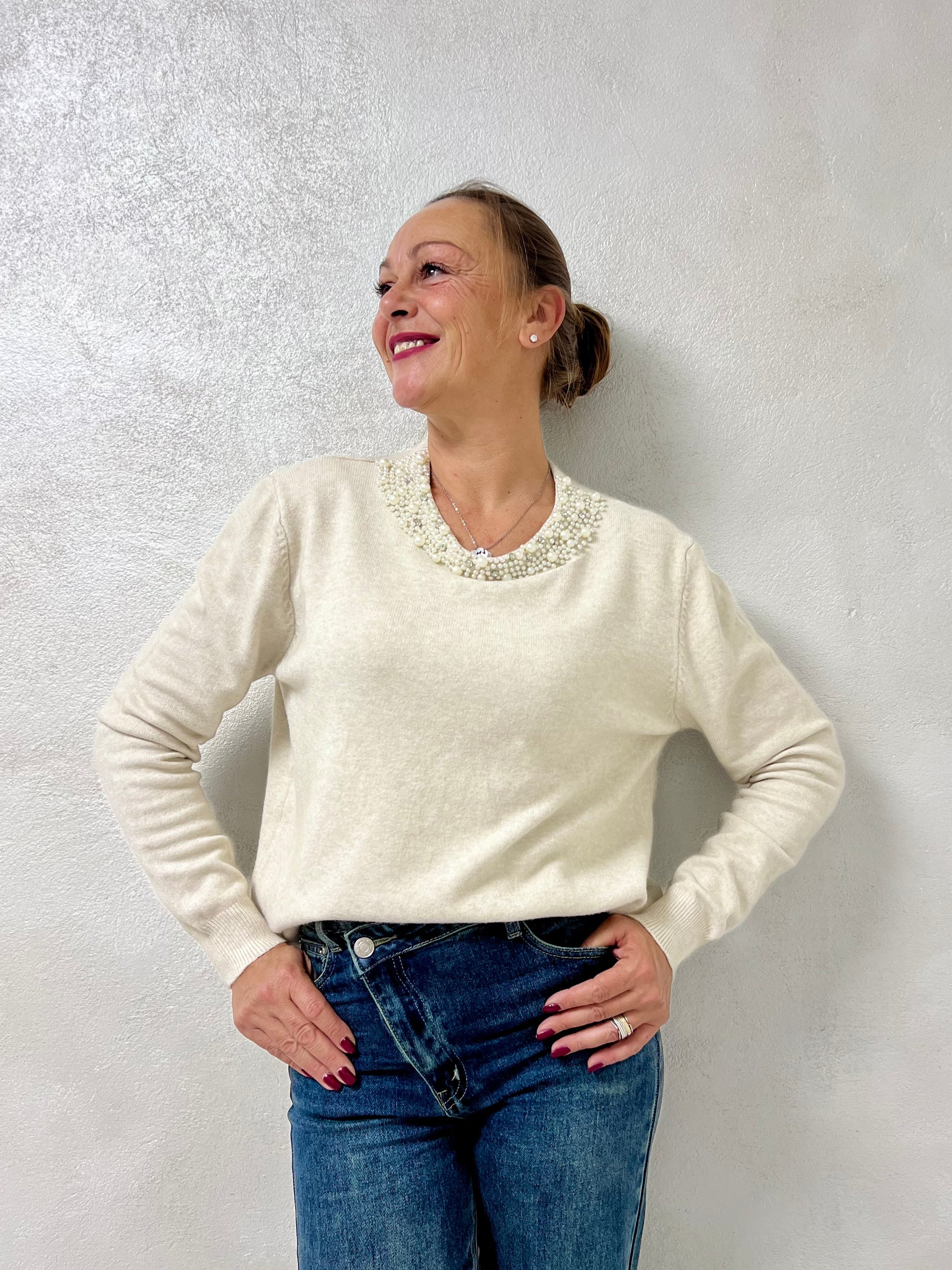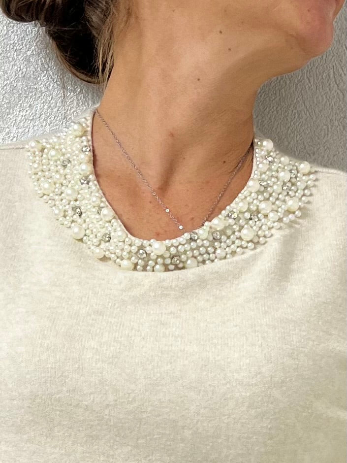 Un modello semplice ma con un tocco prezioso. La maglia Elena conquista per il suo girocollo decorato da perle fissate con piccoli chiodini, che aggiungono luce e raffinatezza senza risultare eccessive.