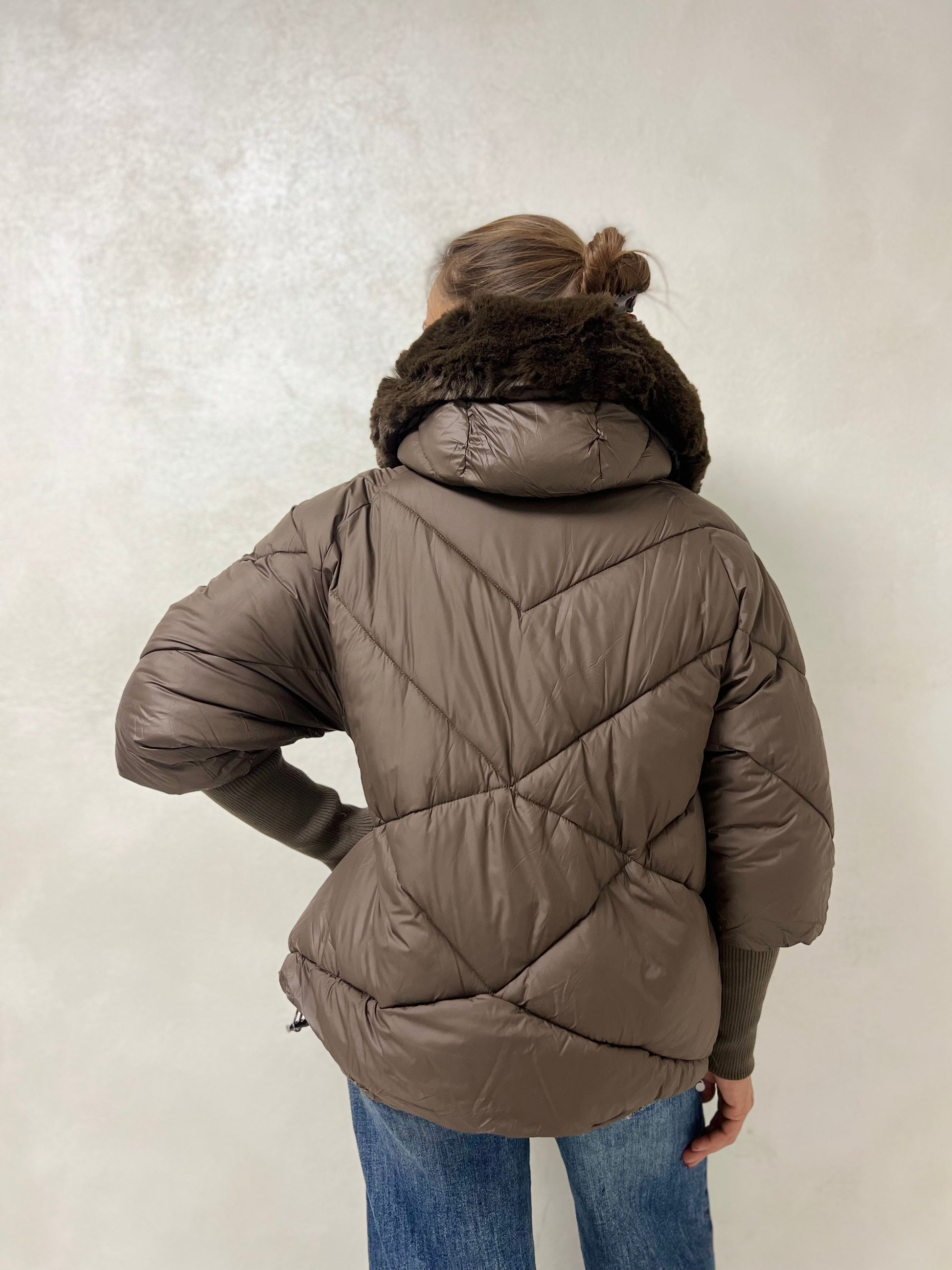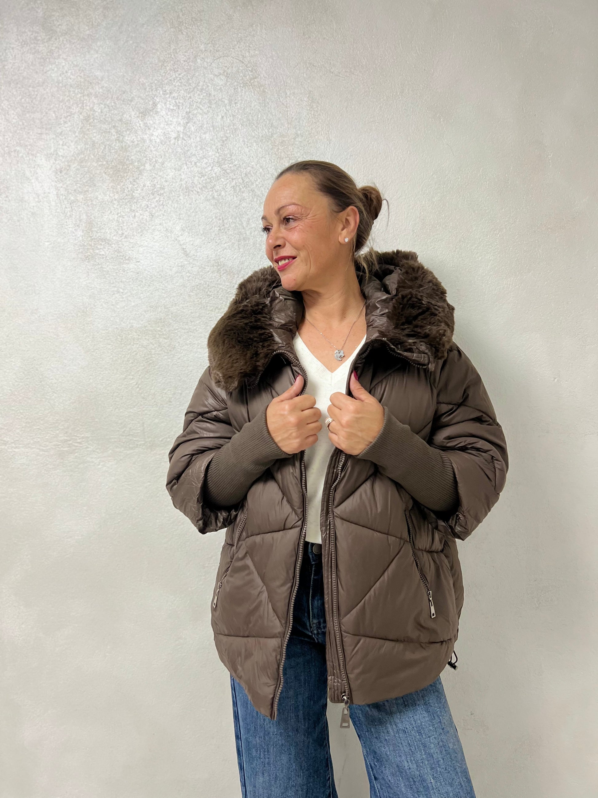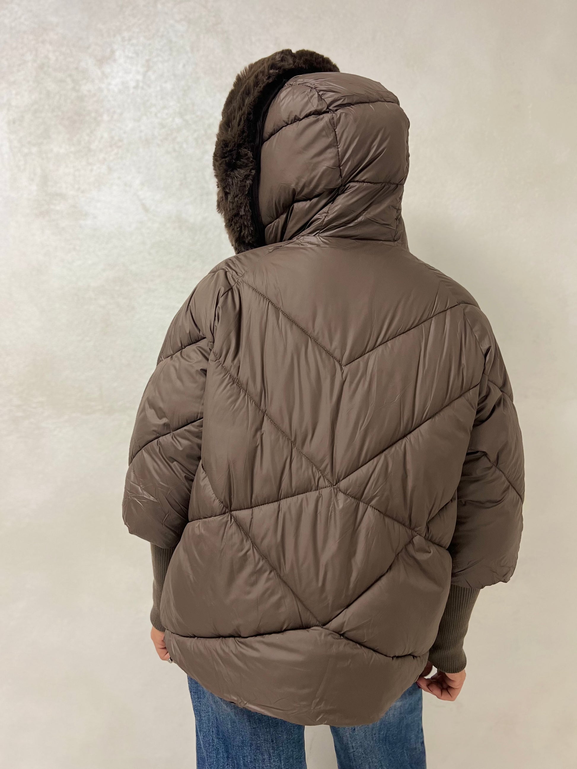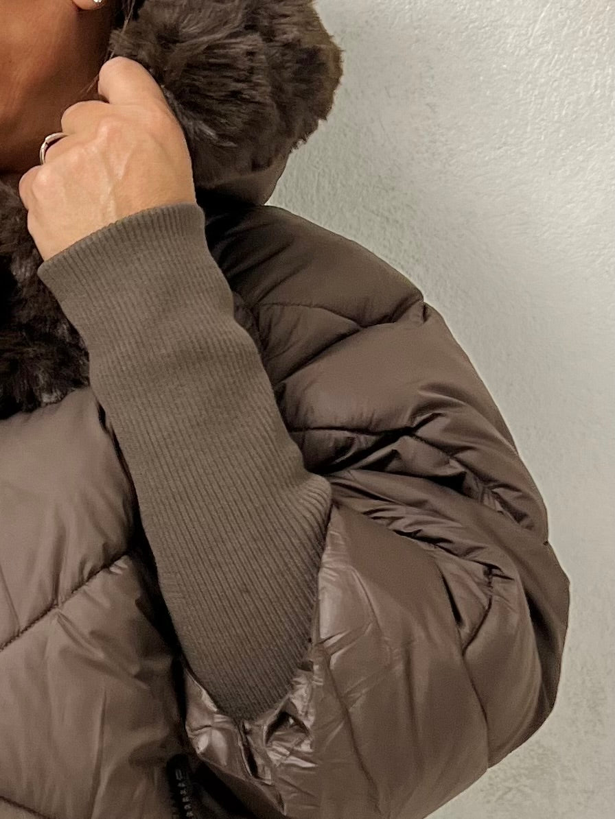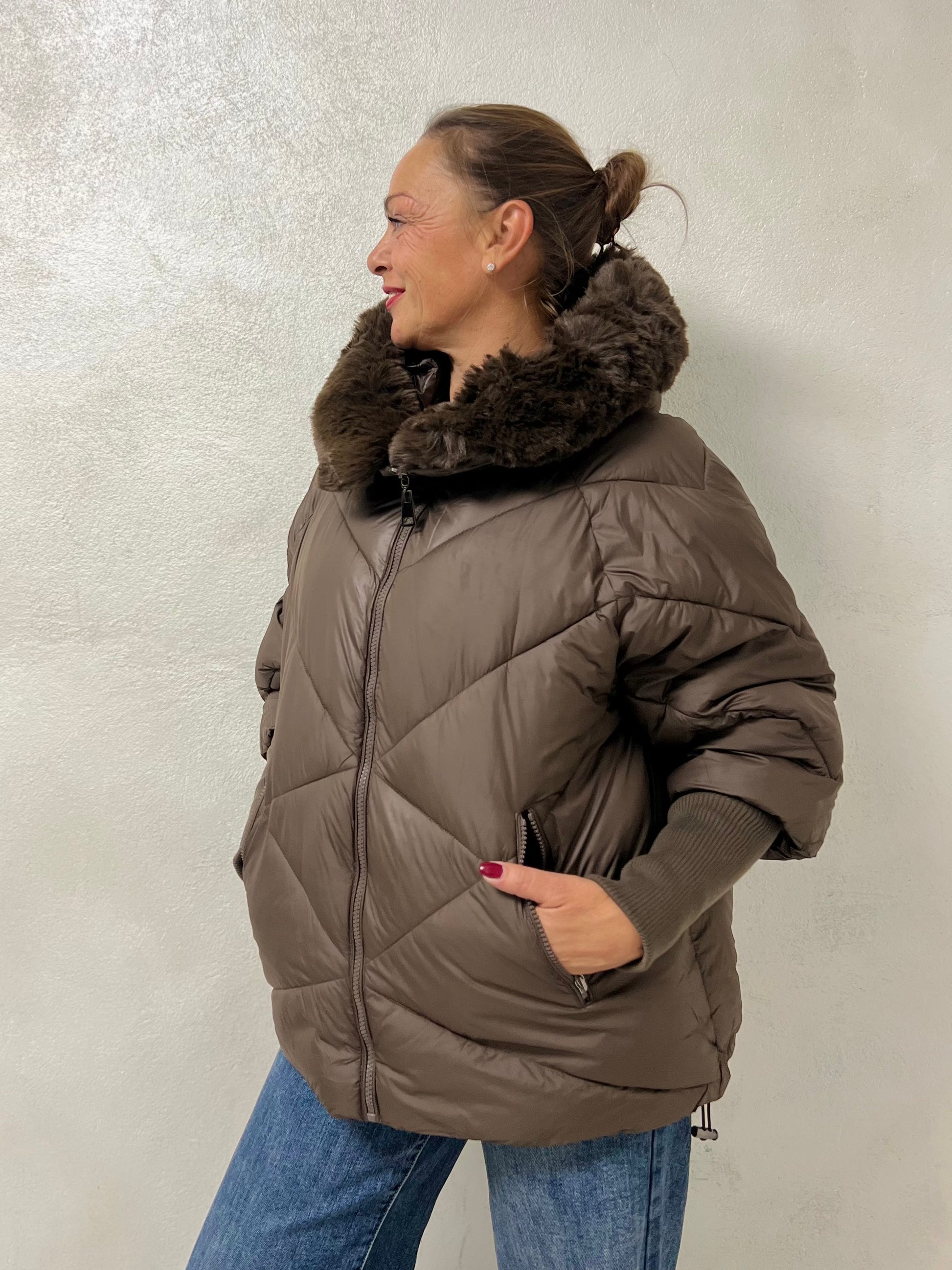 Il taglio morbido e il collo in ecopelliccia (staccabile) lo rendono estremamente versatile: puoi indossarlo nelle giornate più fredde oppure rimuovere il pelo per un look più essenziale.