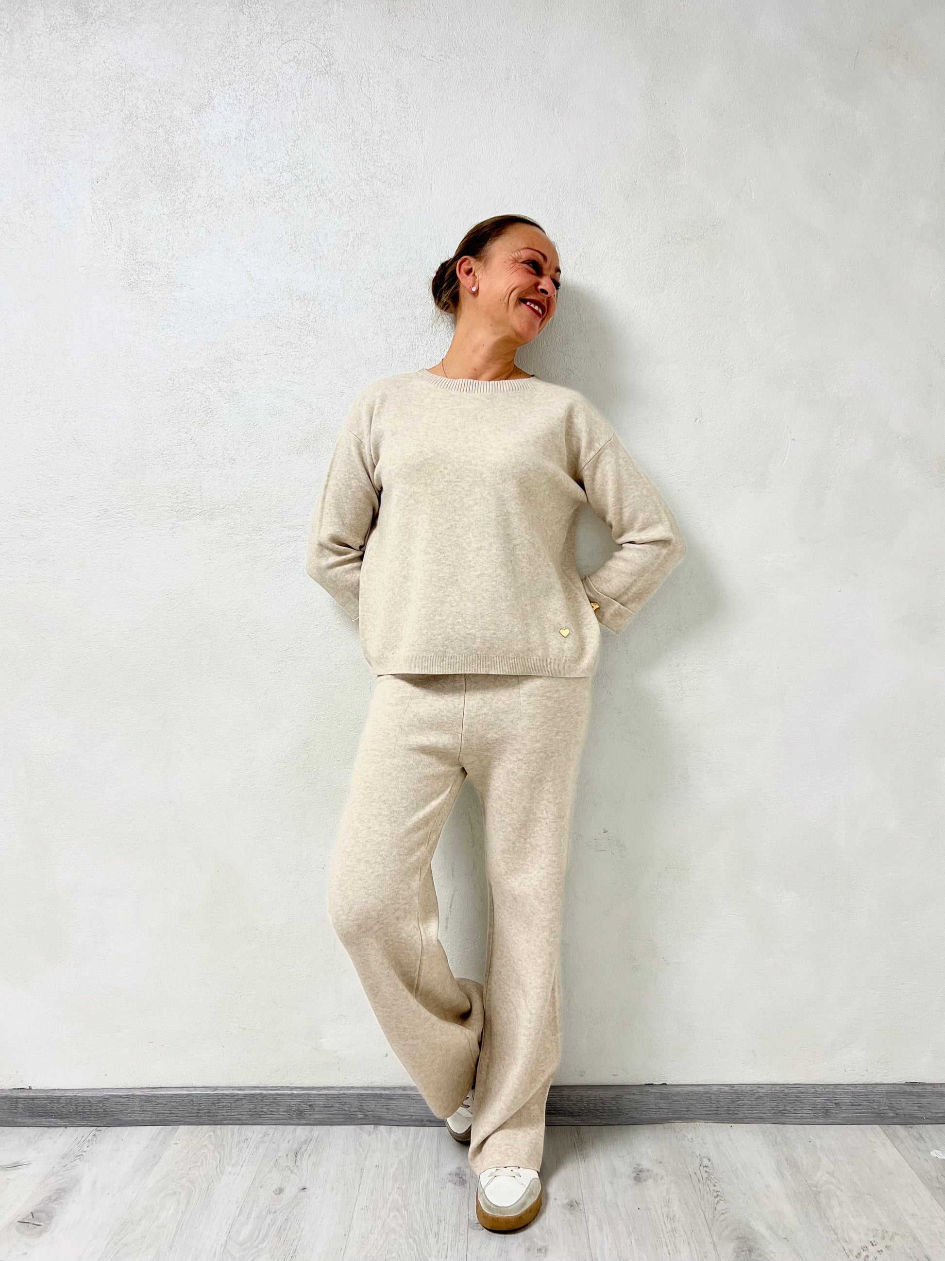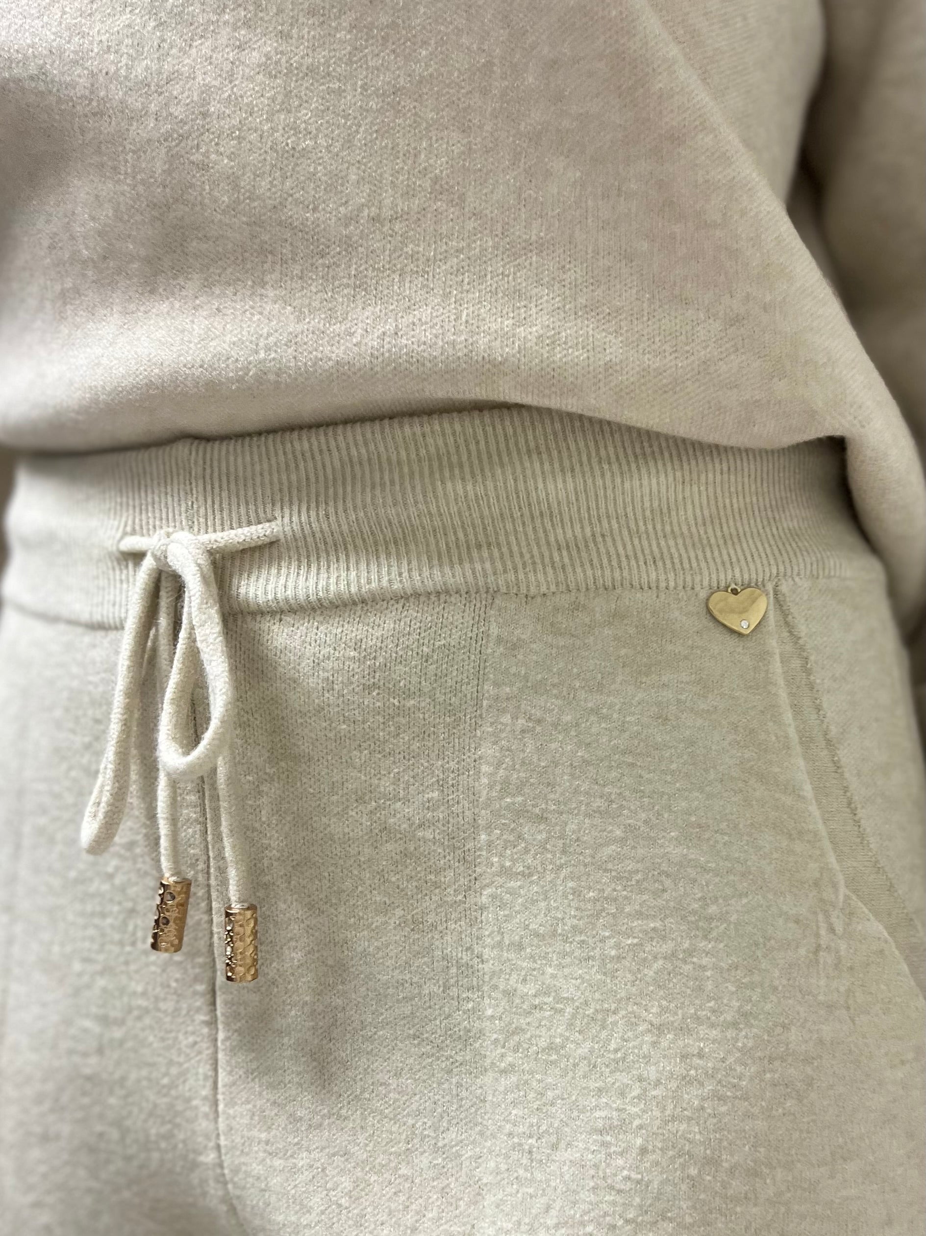 Il pantalone presenta elastico in vita con coulisse regolabile, tasche laterali e una gamba ampia che dona movimento e slancio alla figura. Anche qui un cuoricino applicato vicino alla tasca sinistra completa il look con delicatezza.