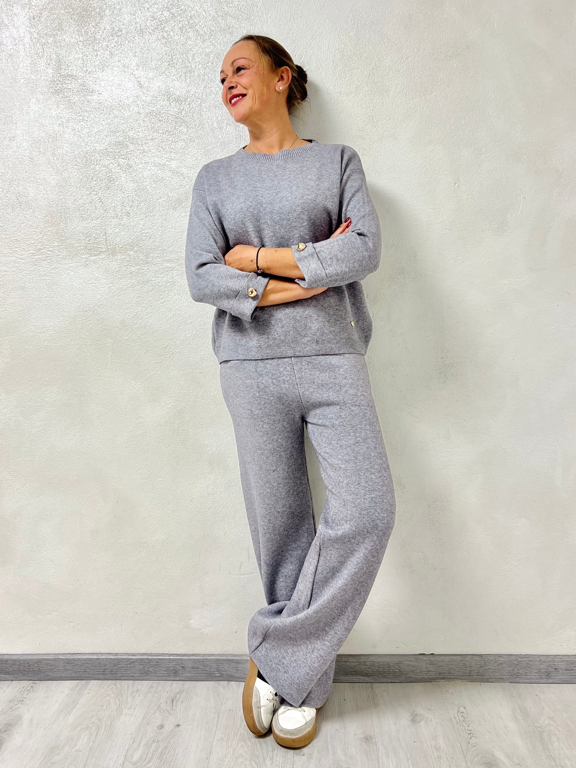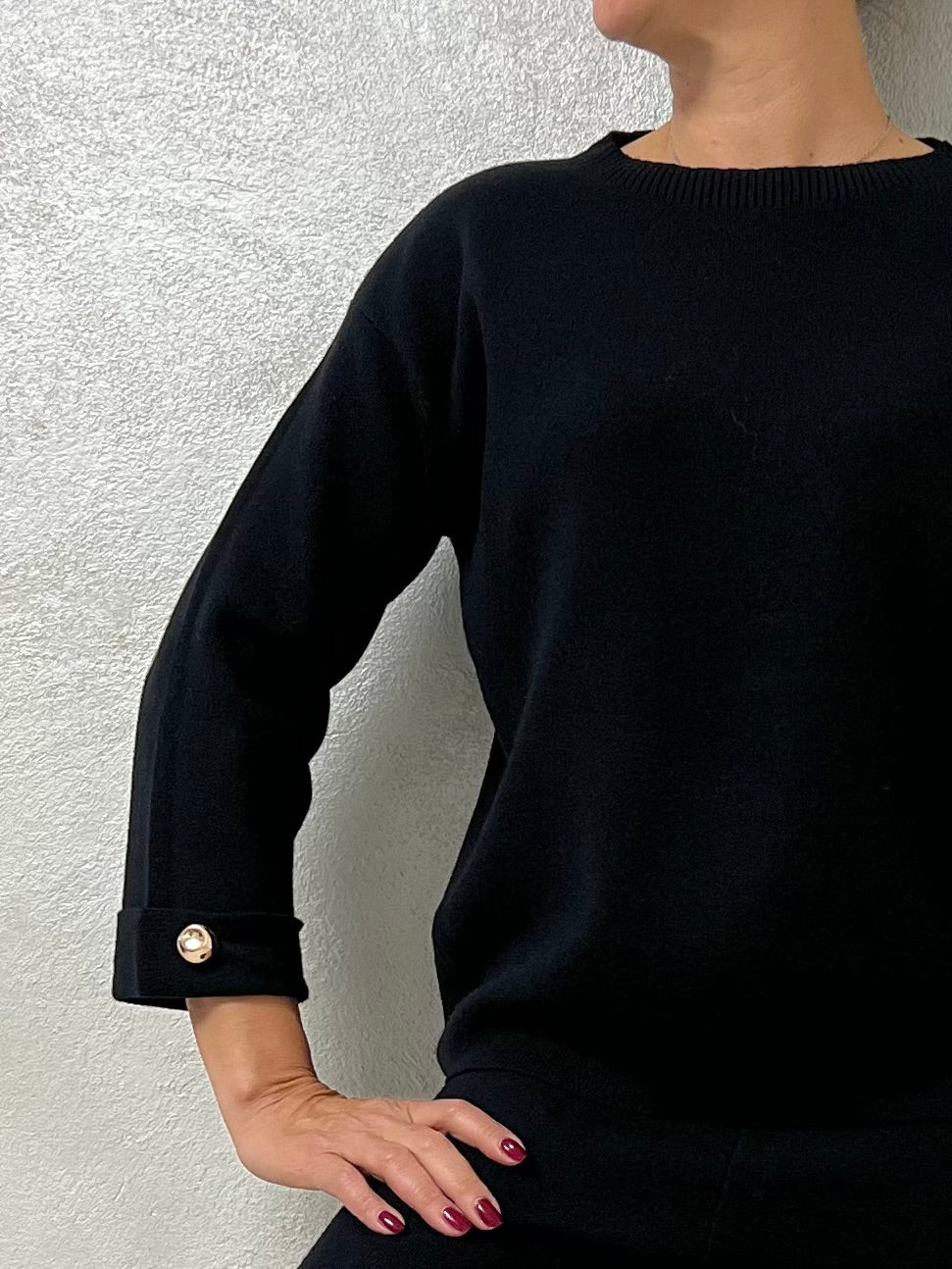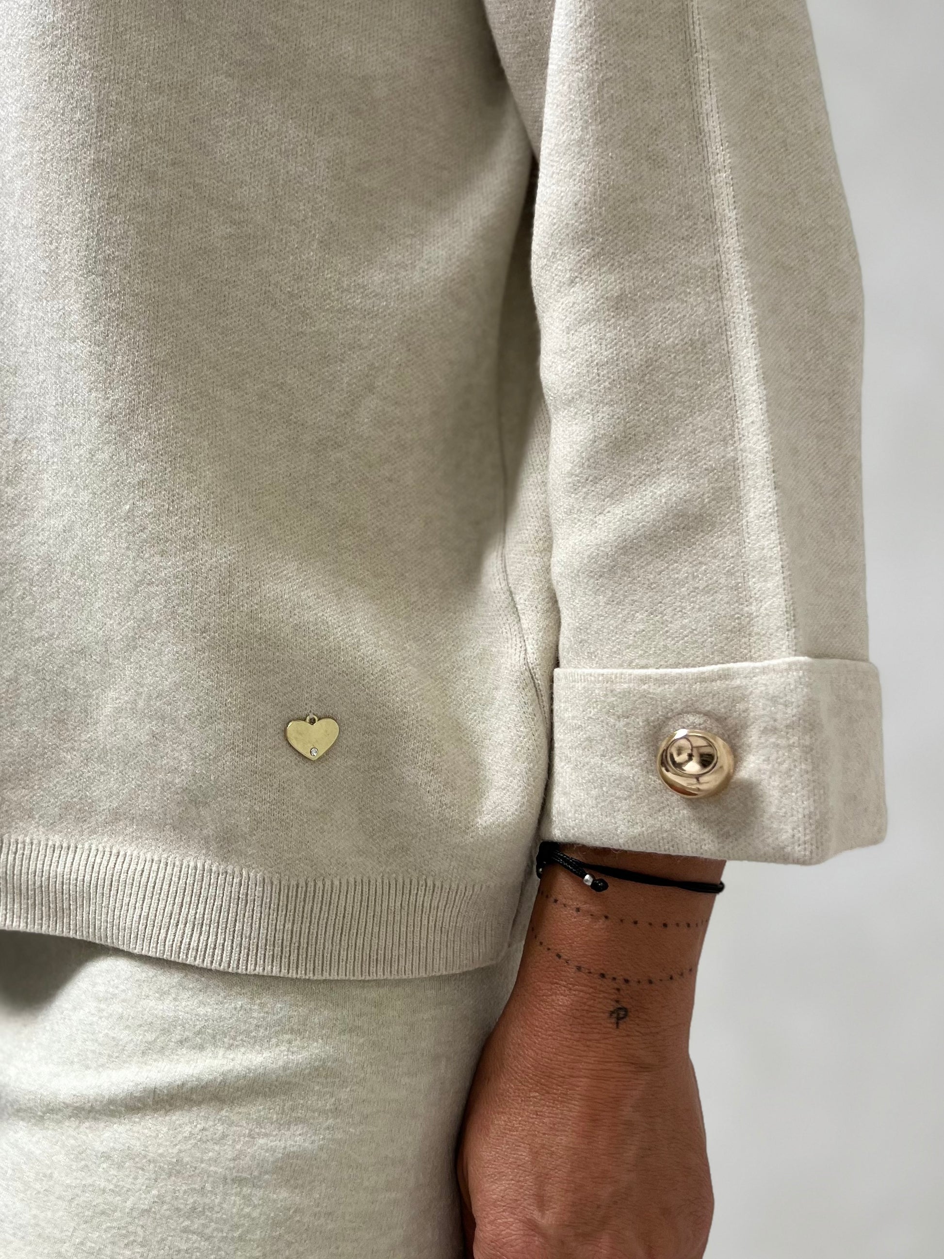 La maglia ha un taglio pulito e raffinato, con polsini risvoltati impreziositi da un bottone dorato e un piccolo cuoricino applicato sul fondo sinistro.