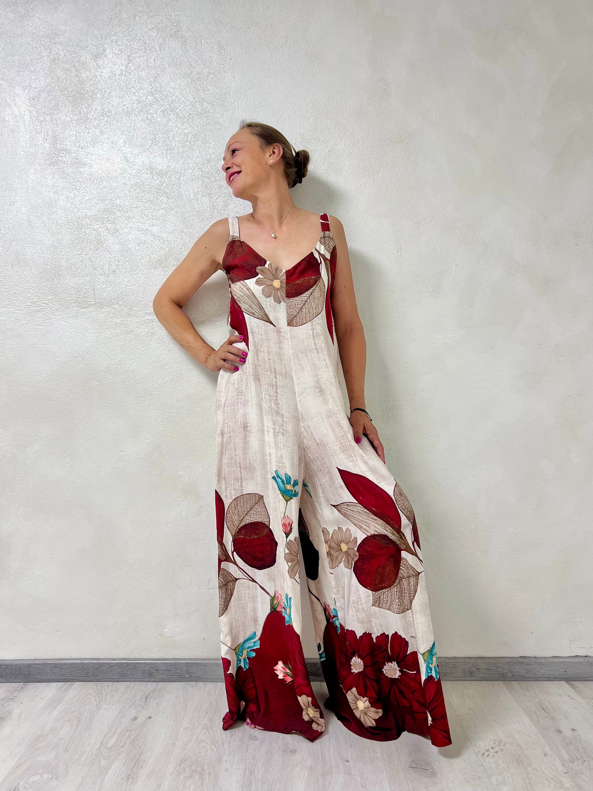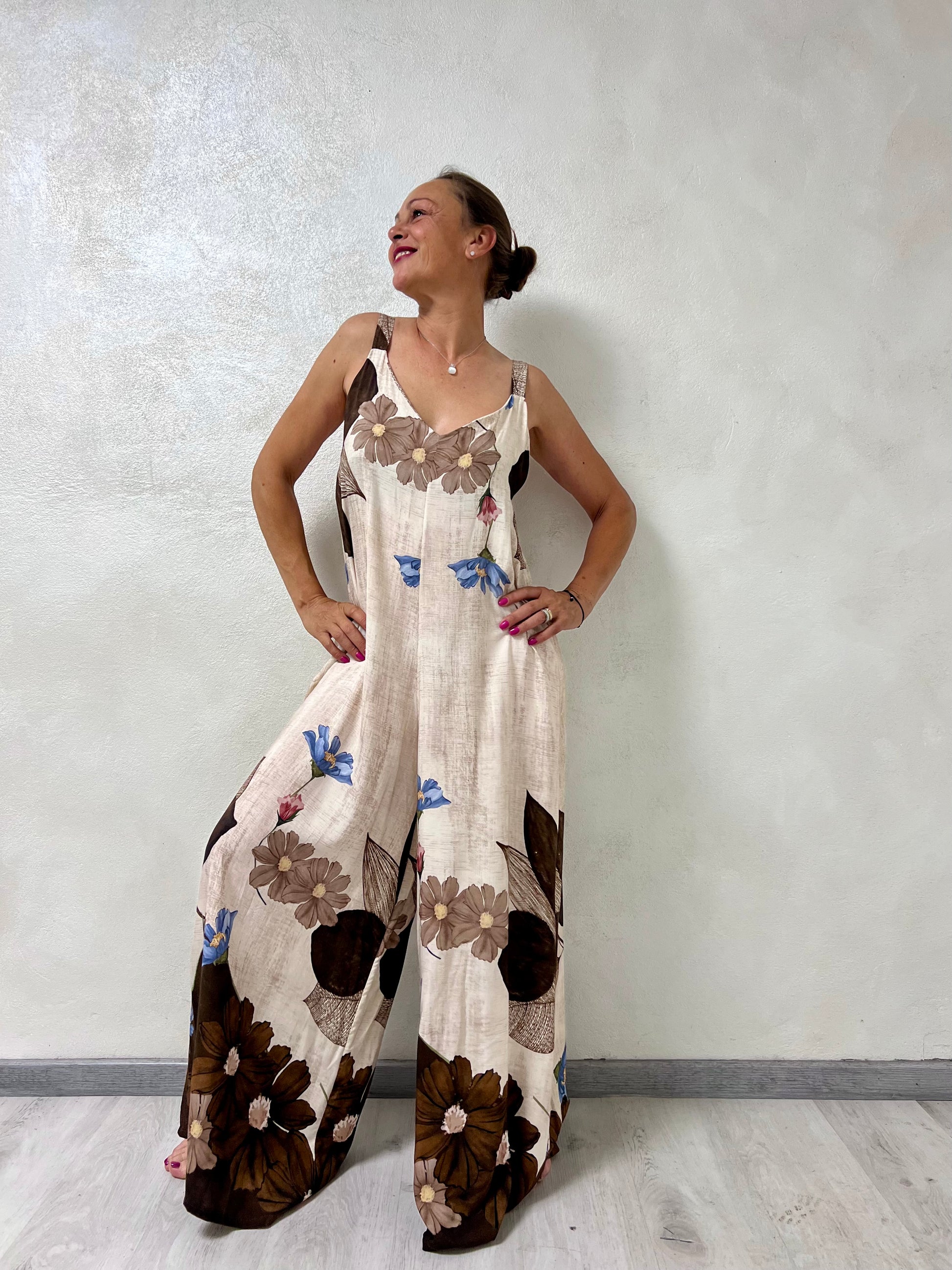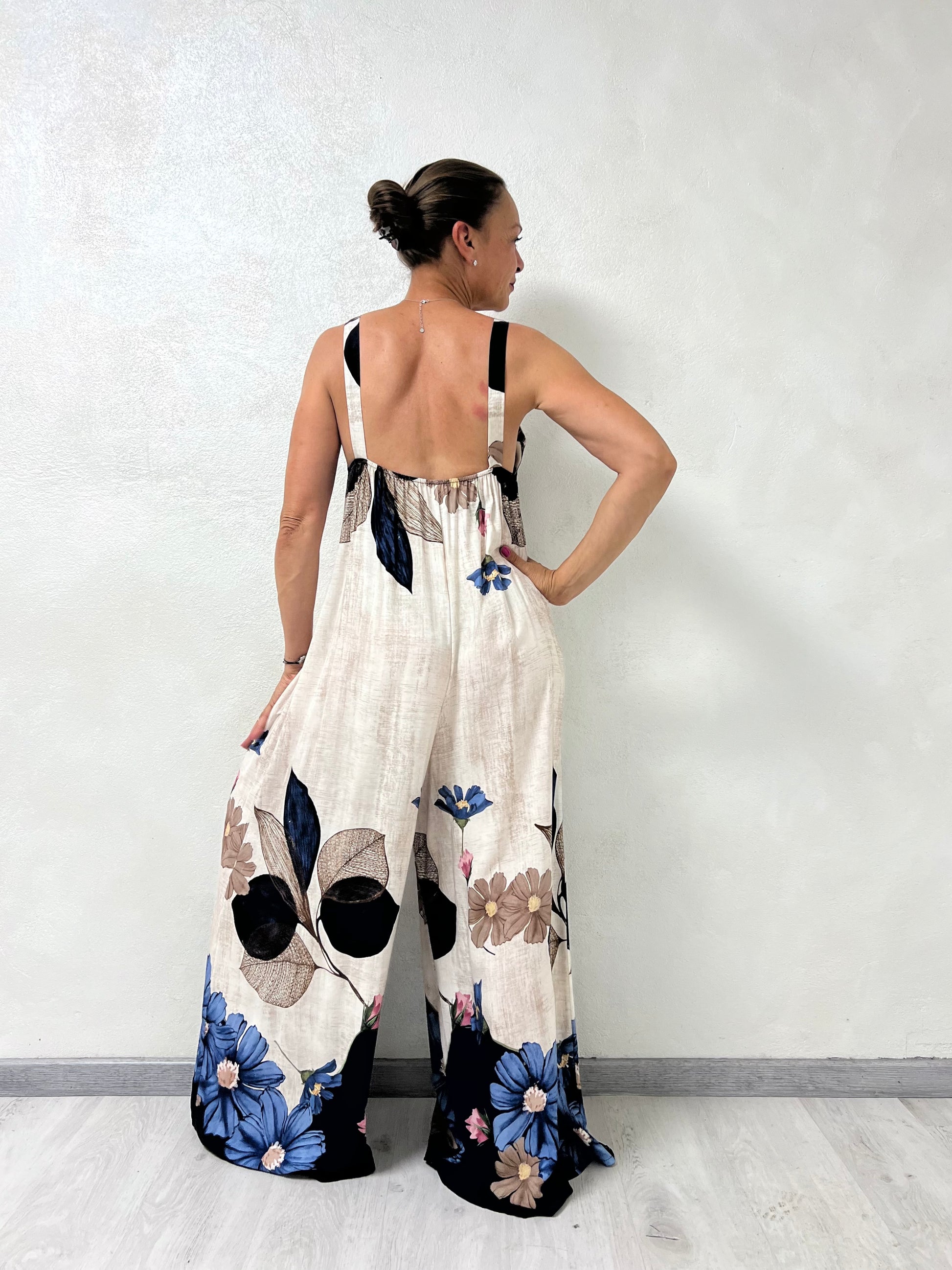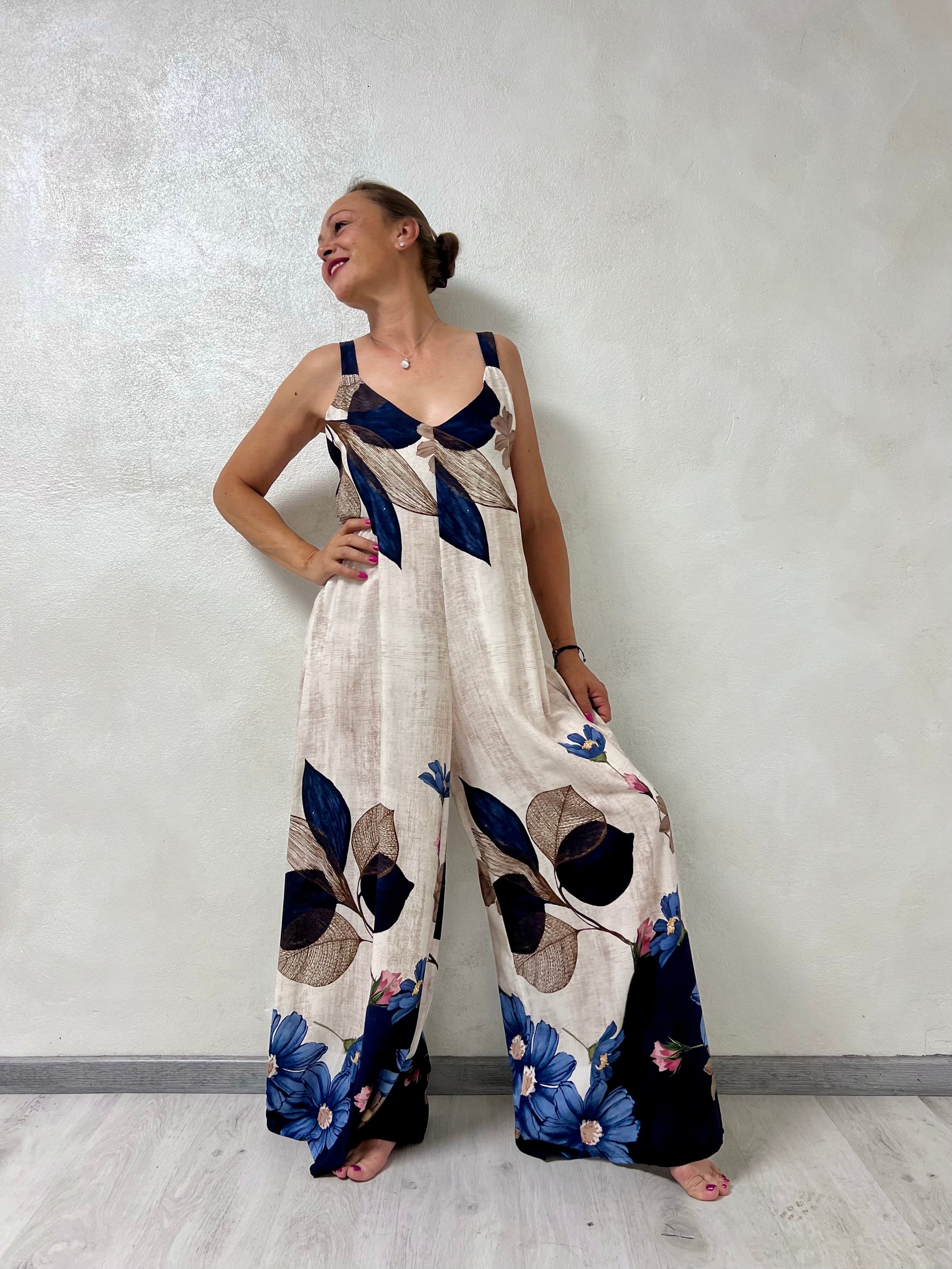 La scollatura a V e le spalline larghe valorizzano la figura, mentre la linea morbida e la gamba extra wide donano movimento e un tocco elegante e moderno.