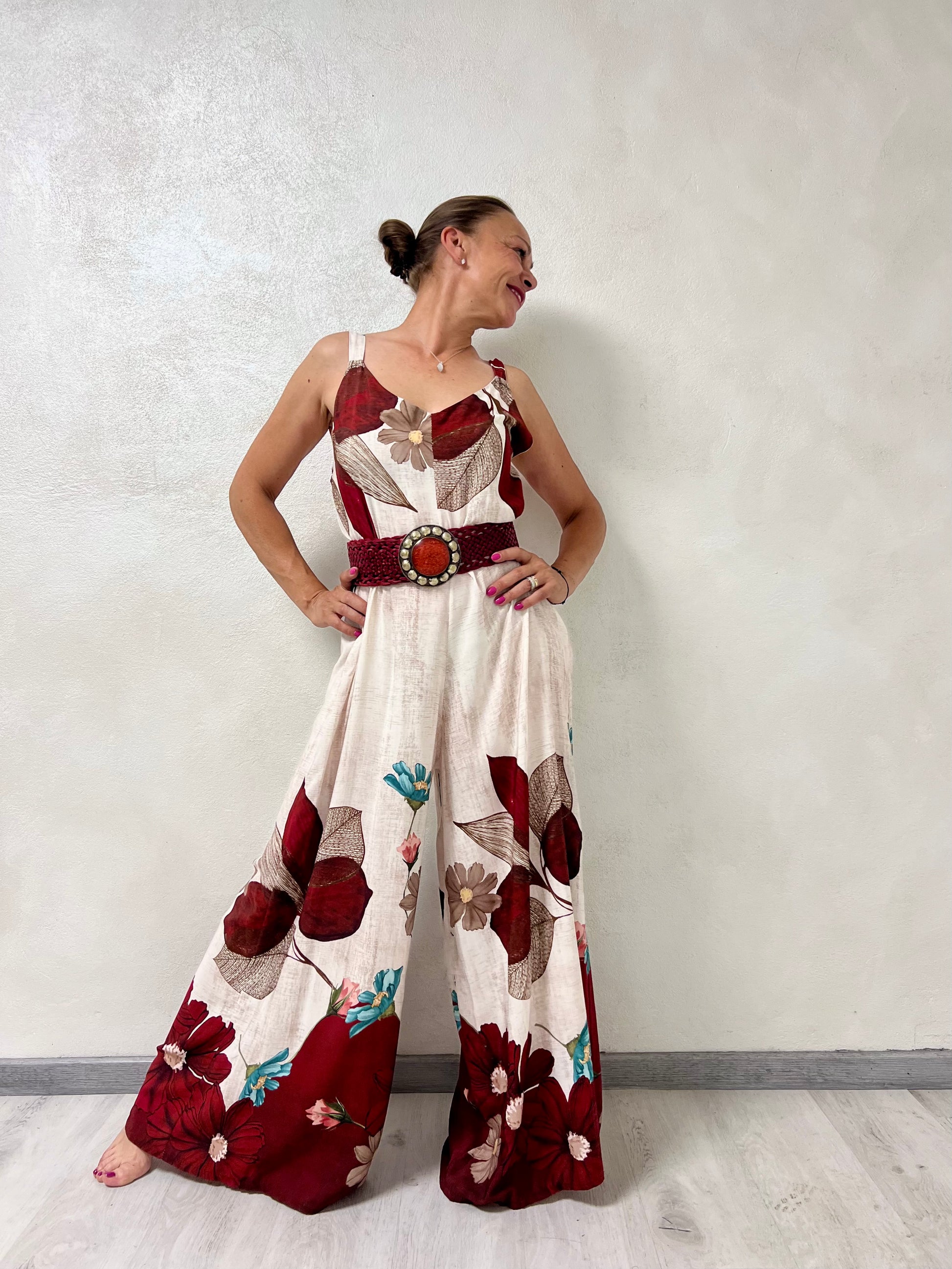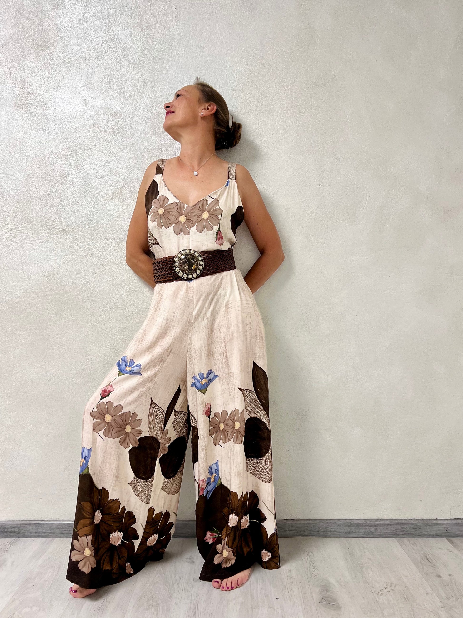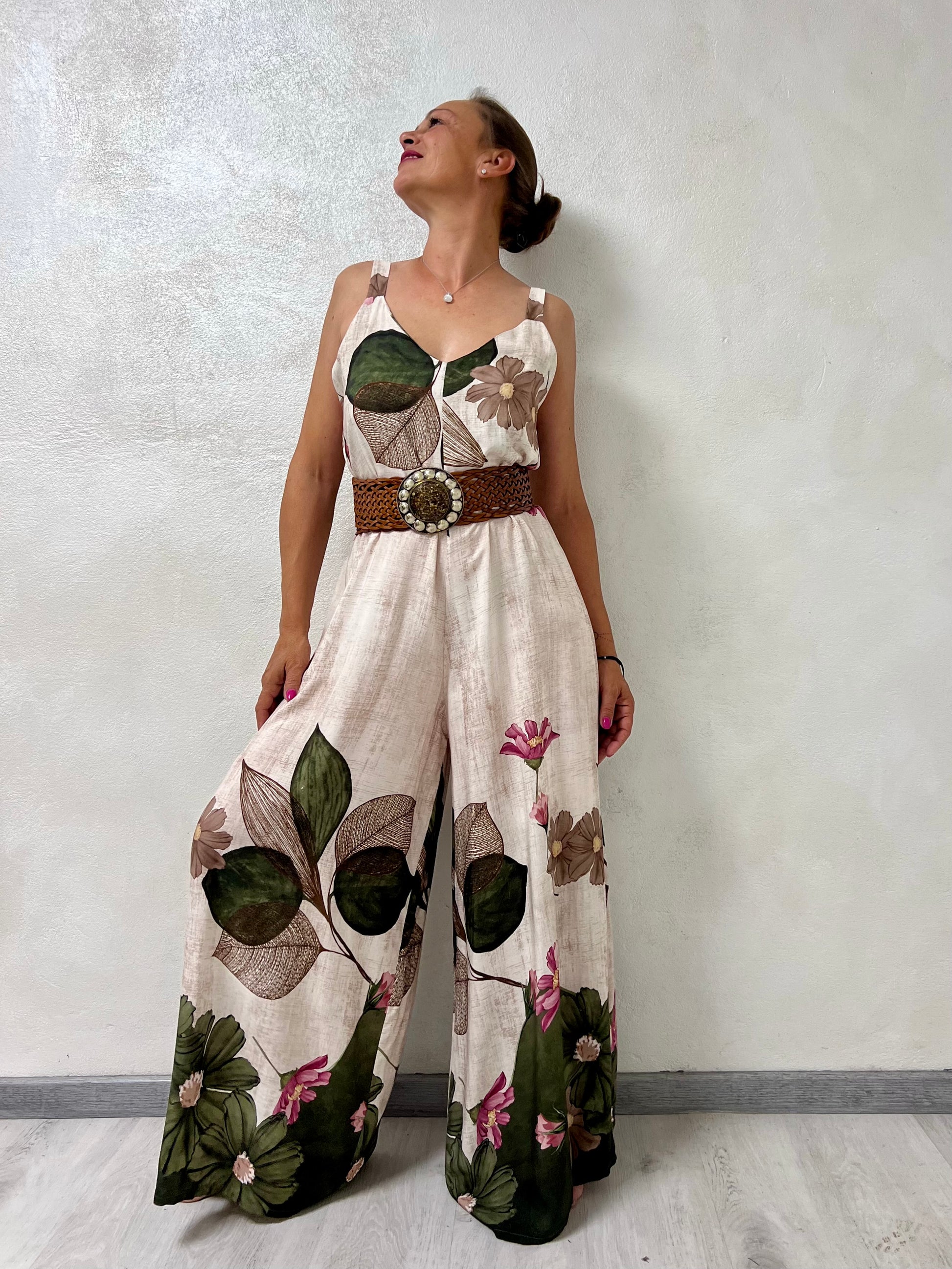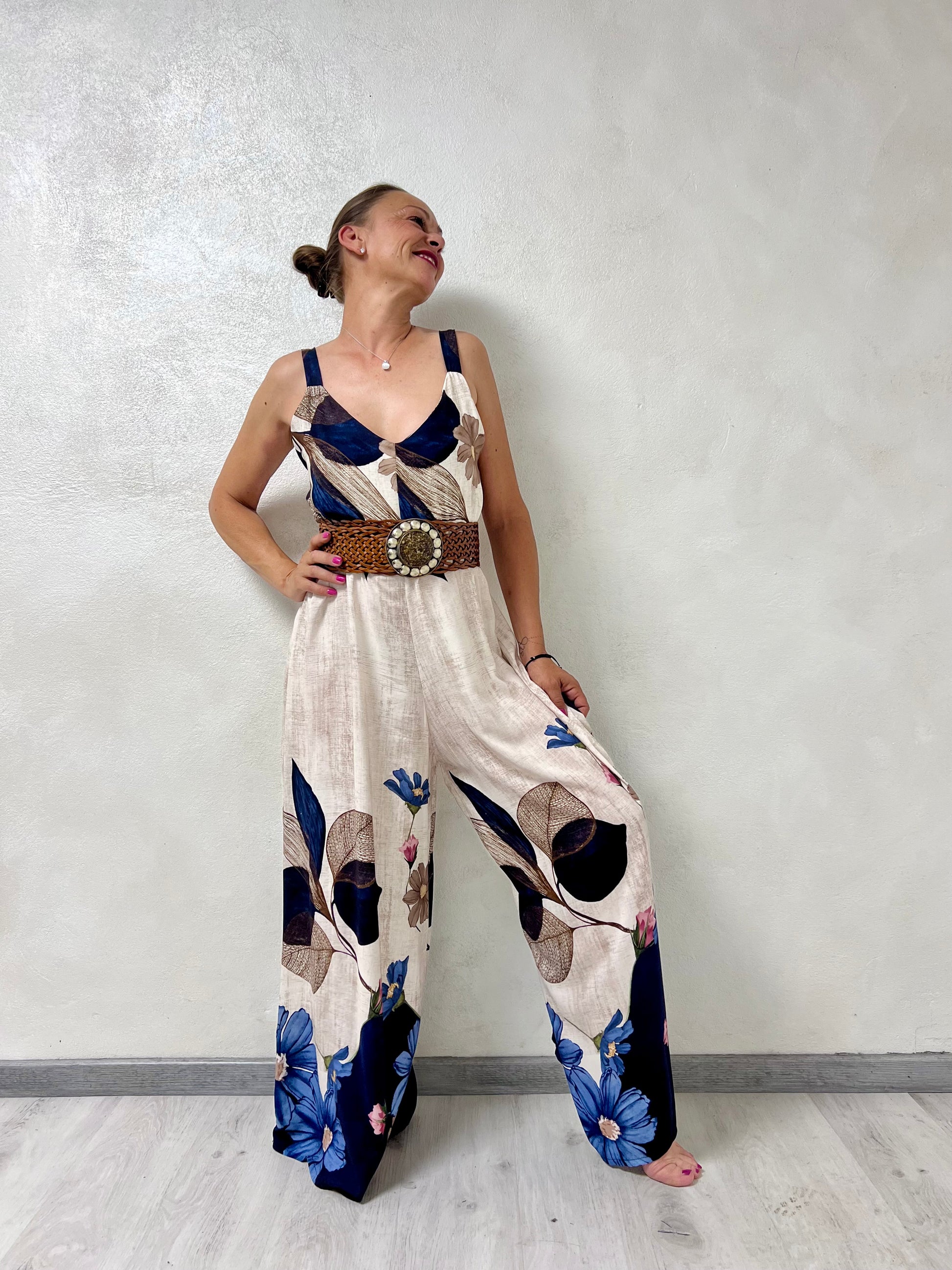 La scollatura a V e le spalline larghe valorizzano la figura, mentre la linea morbida e la gamba extra wide donano movimento e un tocco elegante e moderno.