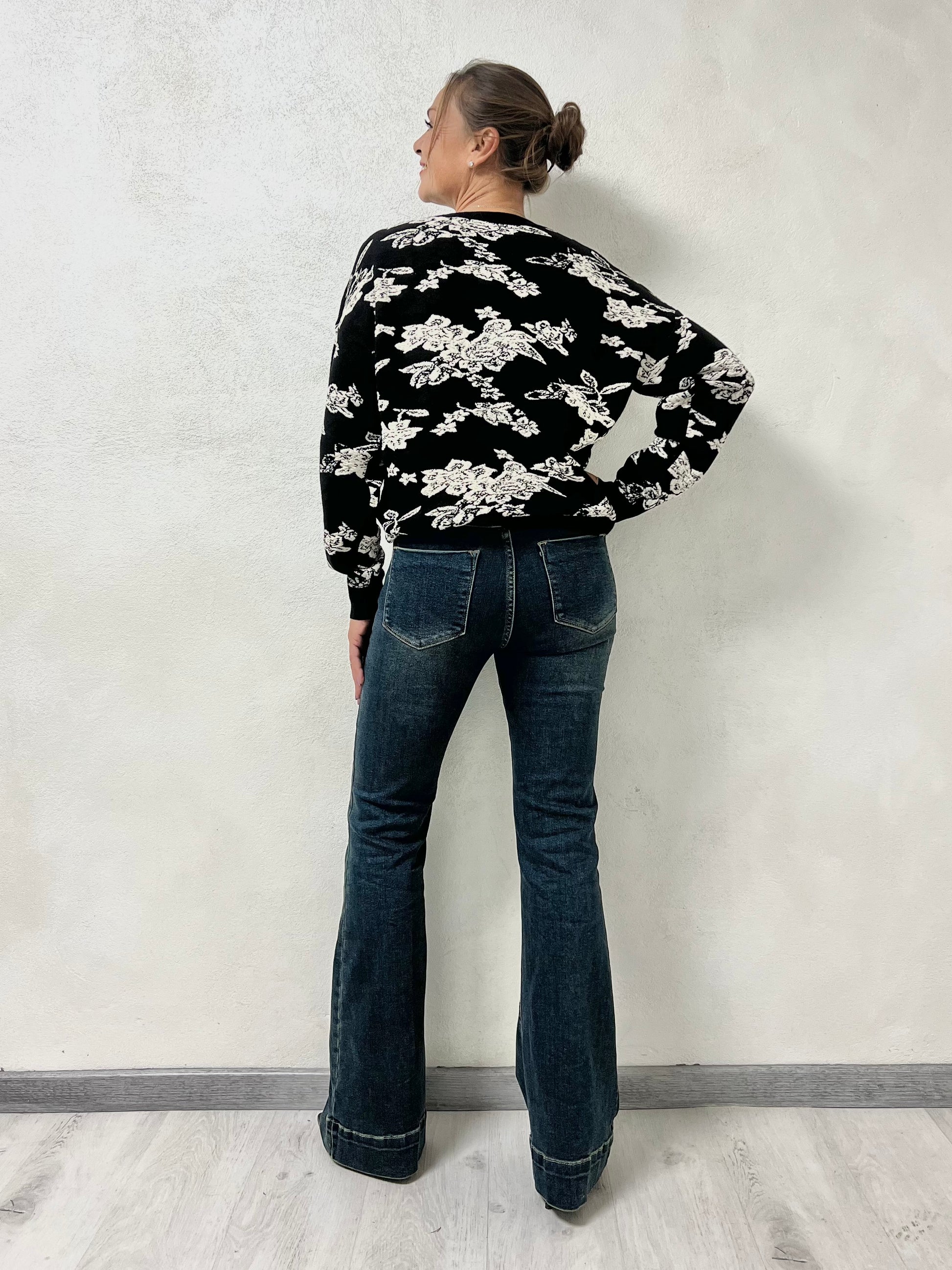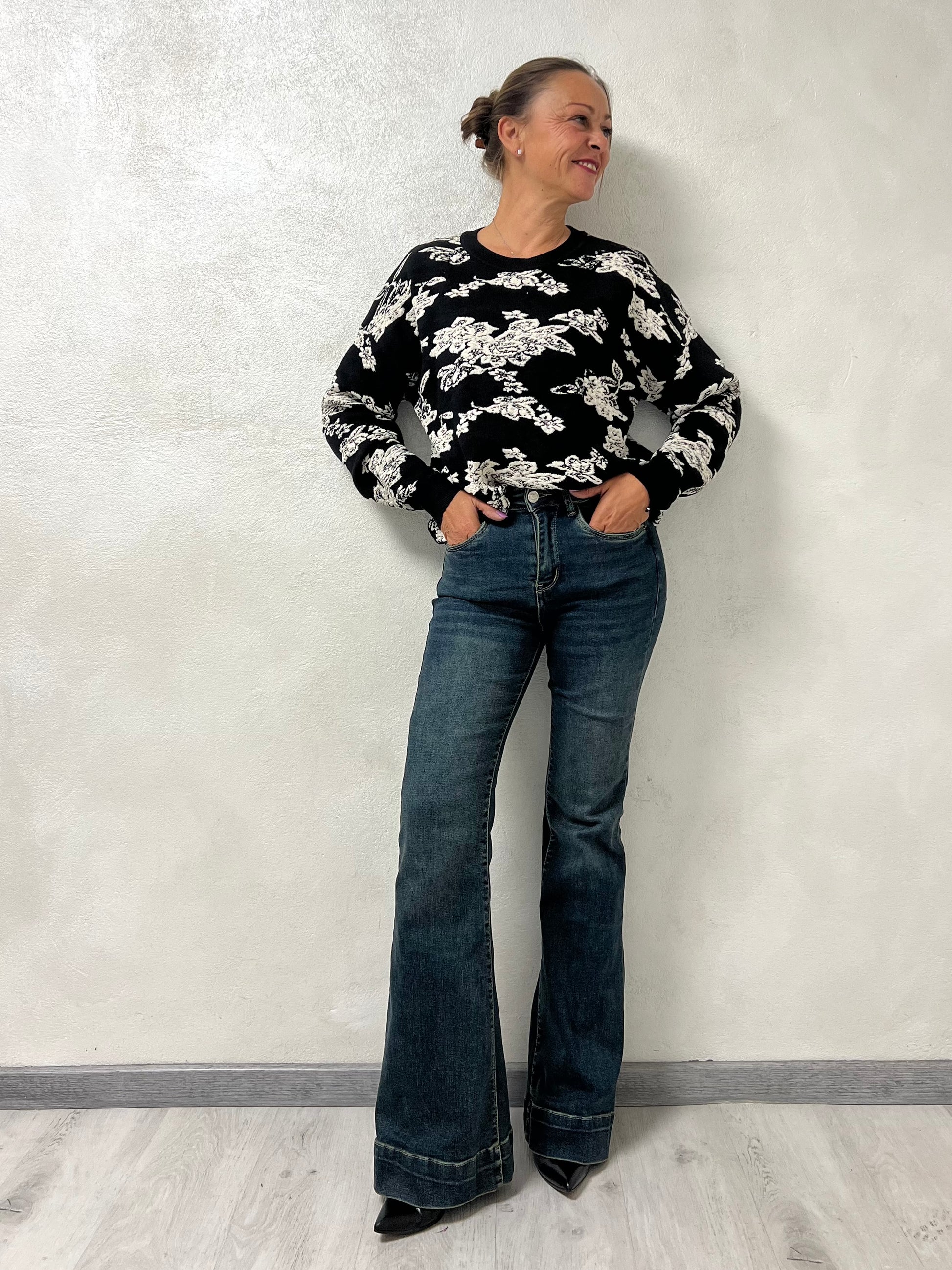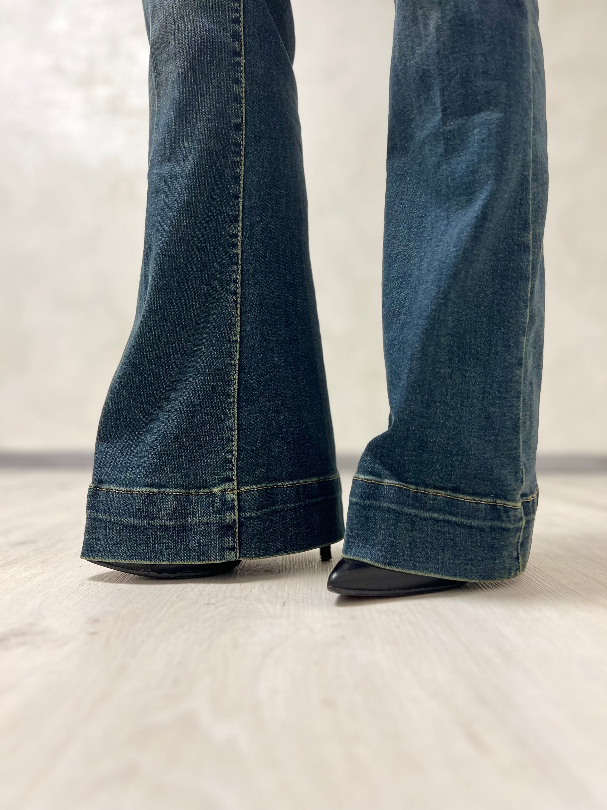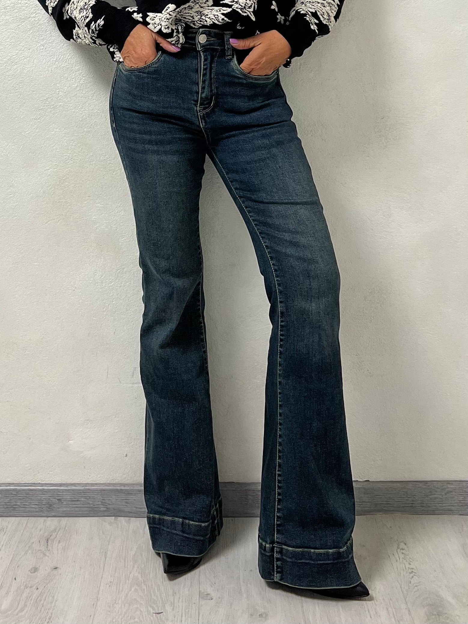 Jeans a vita alta dal taglio a zampa, realizzati in denim elasticizzato che valorizza le forme e slancia la figura. Il lavaggio scuro e le leggere vintage donano un effetto snellente e raffinato.